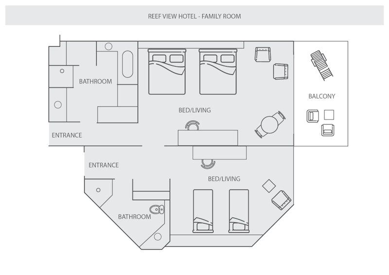 Reef Family Room From $549* per night With an abundance of space, two bedrooms, and all the facilities of a four-star hotel, the Reef Family Room is the perfect family getaway. Why you’ll love the Reef Family Room: The beautiful views - either over the Whitsunday Islands, or the hotel’s landscaped garden. The adjoining, yet separate bedrooms - one master suite with two queen beds, and a junior room with two single beds (perfect for young children). The plentiful in-room entertainment, including TV, in-house movies (charges apply), iPod connectivity and more. Conveniences like room service, and direct access to the Reef View Tour Desk - for organising day trips and activities. When would you like to visit? Reef View Hotel qualia Beach Club Reef View Hotel Palm Bungalows Arrival Date: Departure Date: Adults 1 Adult 2 Adults 3 Adults 4 Adults 5 Adults 6 Adults (13+ years) Kids 0 Kids 1 Kid 2 Kids 3 Kids 4 Kids 5 Kids (3-12 years) Infants 0 Infants 1 Infant 2 Infants 3 Infants 4 Infants (0-2 years) Check availability What is included? Return airport/marina transfers Use of paddle skis, windsurfers, catamarans & snorkelling equipment Use of Island Shuttle Use of gym, spa, sauna & tennis court hire Kids Stay and Eat Free^ FREE wireless internet View Floor Plan Details at a glance Number of rooms 14 Room size 97m² Location The Reef View Hotel Family Rooms are positioned on the levels four to eighteen and located adjacent to the lifts. The Reef View Hotel is located right opposite Catseye Beach. View Views over the Coral Sea, or the hotel’s landscaped gardens. Disabled rooms No Bedding Two queen beds and two single beds. Max guests This room caters for a maximum of 6 guests including children. Facilities Air-conditioning and ceiling fan Private balcony En-suite bathroom with shower and separate bath Telephone Free WIFI Television In-house movies (charges apply) Clock radio iPod connectivity In-room safe Room service (limited hours) Bar fridge Mini bar Tea and coffee making facilities Iron/ironing board Interconnecting rooms Housekeeping Non-smoking Microwave qualia - Golf Getaway Play 18 holes at one of Australia’s best golf courses and enjoy three nights’ accommodation, gourmet dinner at Long Pavilion or Pebble Beach, complimentary à la carte breakfast daily and more. Book online now and save up to $345 Find out more Details Facilities Floor Plan Number of rooms Room size Location View Disabled rooms Bedding Max guests Reef View Hotel Enjoyed driving the buggies- relaxing on the beach- view is amazing. Simone Cottell 28 Jun Reef View Hotel The peaceful tranquility of the island- no noise of cars- the slow pace to just chill out. and my favourite - the golf buggies Trevor & Kerry Milgate 19 Jun Reef View Hotel My third time and I am coming back I am going to make it a yearly event just love it. Wendy Shorter 13 Jun Reef View Hotel Tranquility and convenience. There is no need to travel overseas for a holiday when Hamilton island is nearby... William & Penelope Haire 9 Jun Reef View Hotel The ease of everything. Extremely child friendly. Gina Rodriguez 30 Mar Reef View Hotel Having the flexibility of using all Resort pools. Sarah-Jane Maurer 30 Mar Reef View Hotel Easy access to everything, good size room with a great view. David & Jodi Byrne 14 Jan Reef View Hotel Beautiful views, clean and spacious room, and a lovely place to explore and stay; efficient and friendly staff meant we could fully relax and enjoy our stay... Stephanie & Robert Davies 8 Jan Reef View Hotel Beautiful island with amazing scenery. We had a great time! Enjoyed the kids 'stay and eat free' deal. Jack Ong 7 Jan Reef View Hotel The view & the breakfast. Robyn May 5 Jan Reef View Hotel Staff were all very friendly and it had a relaxed vibe. Peter Coe 26 Nov Reef View Hotel Spacious room and room to breathe, good access to pool and beach. William & Sarah Spinney 26 Nov